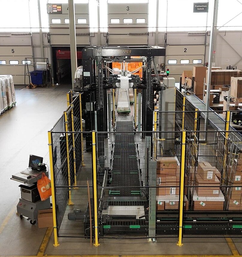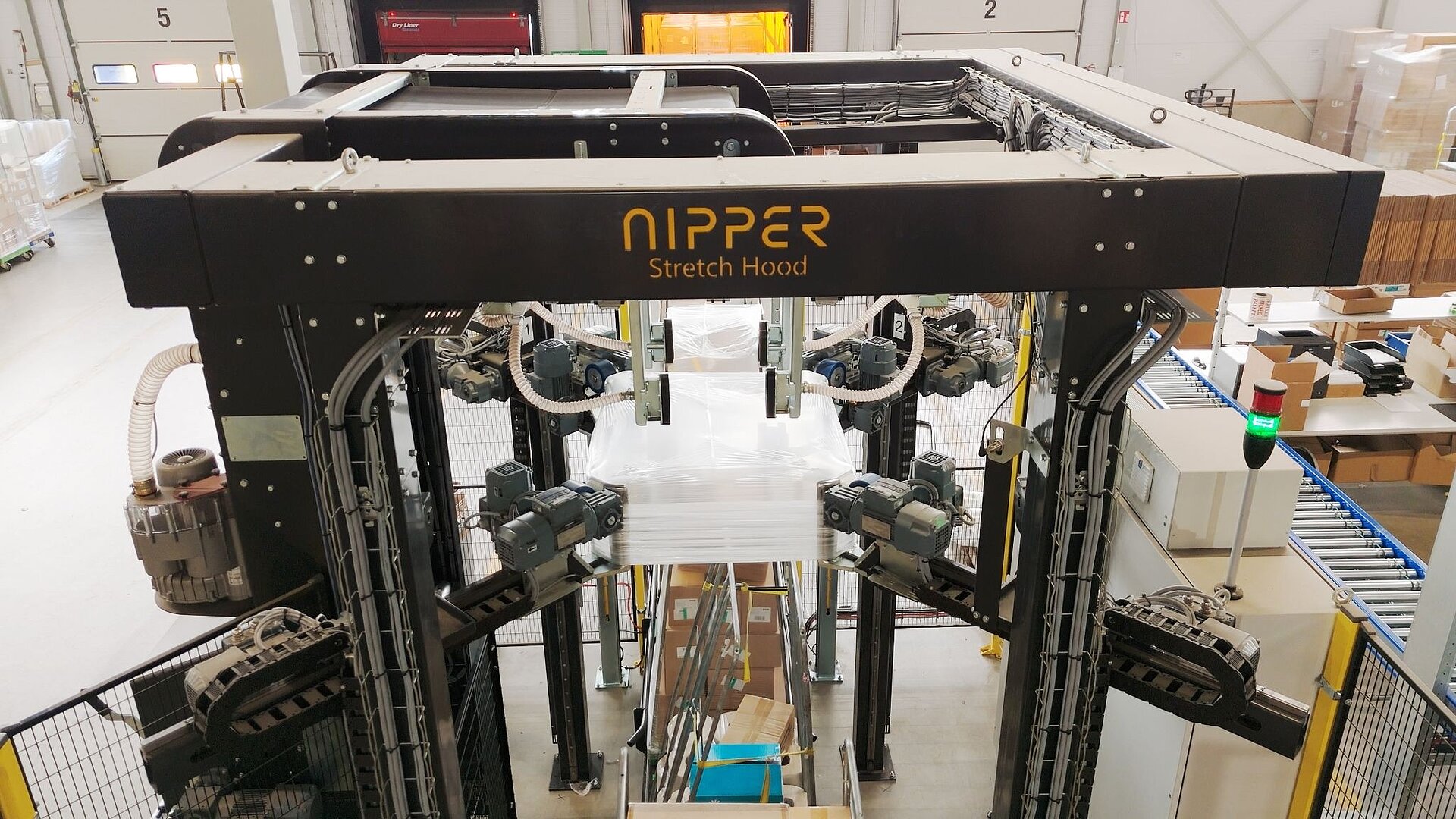 Bunzl Retail & Industry partnered with Nipper BV to implement a stretch hooding machine. This machine was specifically designed to streamline the process of covering roll containers with stretch hoods, improving efficiency and ergonomics. The Nipper stretch hood machine was tailored to fit seamlessly within Bunzl’s existing warehouse setup, particularly at the dock where the containers were handled. To accomplish this Nipper implemented a unique corner in the loading bay for the Stretch Hood. The machine's design allowed for easy integration into the operational flow, ensuring that it could perfectly fit the layout and handle the volume of work at Bunzl's facility.