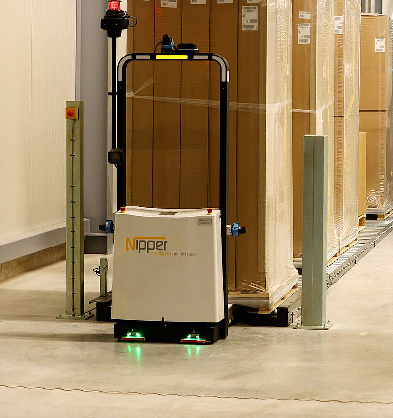 To address this challenge, M&G Group explored several options. Afert investigating a couple of options, an AGV solution was deemed the most flexible approach. To deliver a flexible solution in the entire logistical chain Nipper has installed it's AGV in combination with the Nipper Stretch Hood. This provides a flexible solution where operators can easily notify the AGV system that a pallet is ready for pickup. This allows for more operational flexibility, eliminating the traditional forklift method and increasing safety.