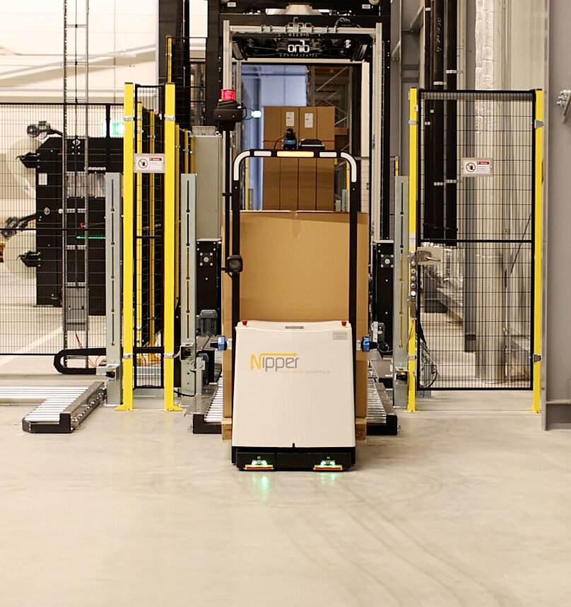 Discover how M&G Group optimized their internal pallet transport and packaging with Nipper AGVs and the Nipper Stretch Hood.