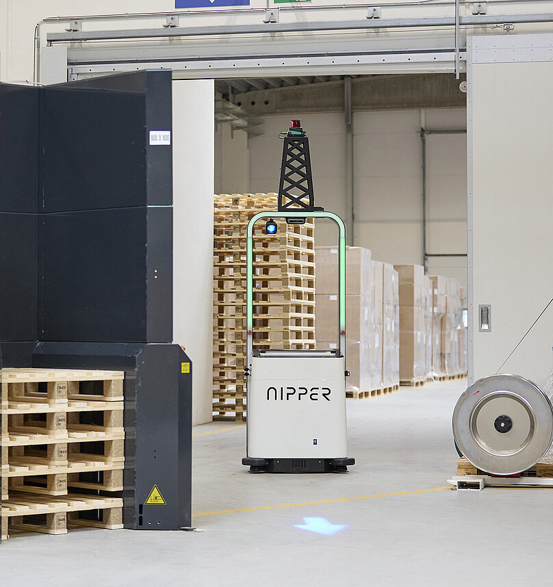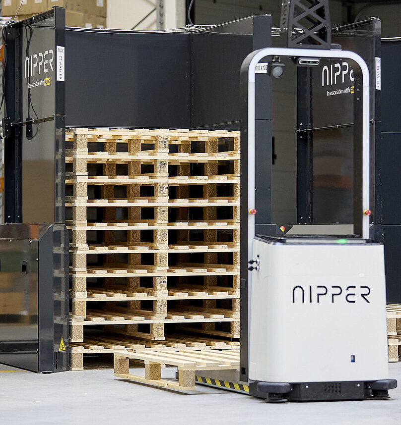 - Outbound logistics: A second Nipper manages the full pallet flow, starting with pallet dispensers for delivering or picking up empty pallets and transporting loaded pallets from production through a strapper, wrapper and finally to the outbound dock.